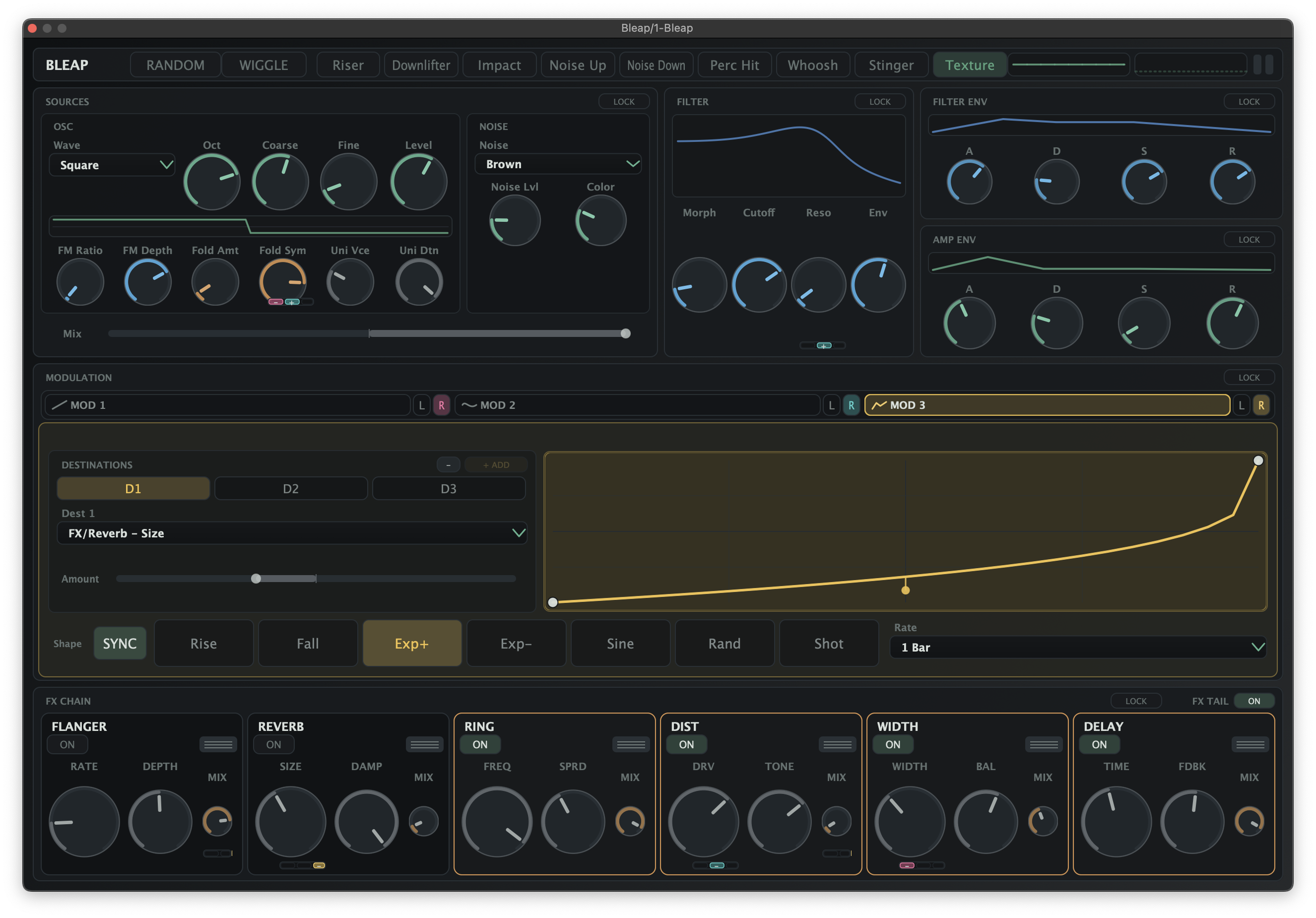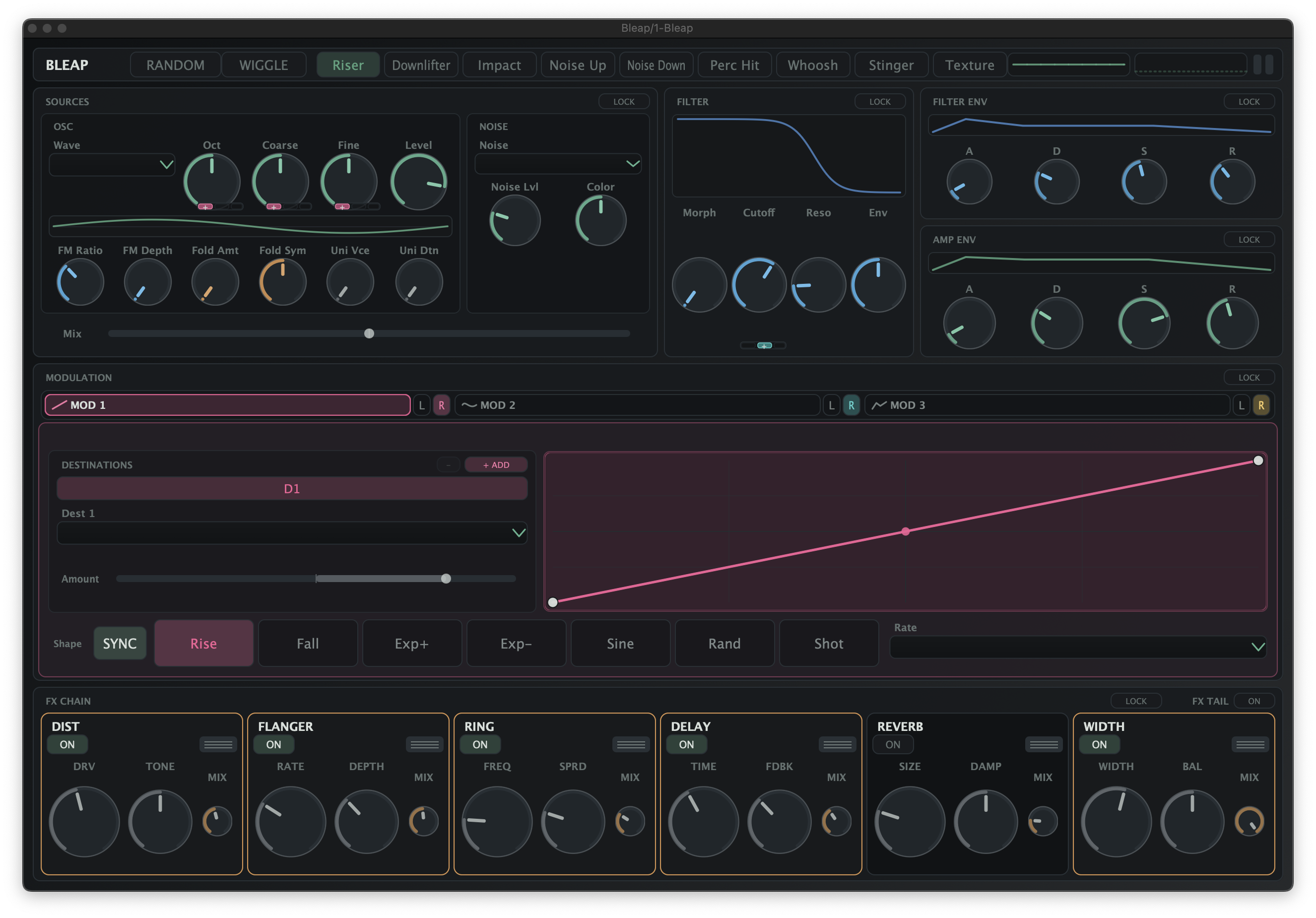 Bleap is less about building a full synth patch from first principles and more about reaching usable cinematic or production FX quickly. The UI, modulation slots, and onboard FX all push toward one-shot gestures and transitional sounds rather than traditional keyboard-instrument programming.